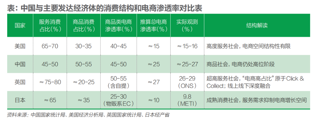 在中国,若商品消费占55%,商品类电商渗透率可达45%-50%,则总电商渗透率约25%;在美国,商品消费仅35%,即便商品类电商渗透率达40%-45%,总渗透率也仅15%-16%;在英国与日本,这一规律更加明显,日本电商的渗透率不到10%。